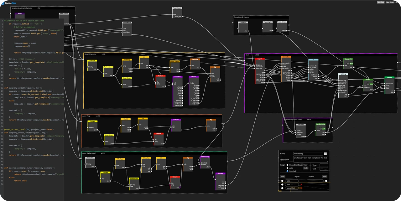 Potente herramienta nodal para que puedas representar tus pipelines, el flujo de archivos y el código de transformación de tus producciones.Simple nodal tool so you can represent your pipelines, the flow of files and the transformation code of your productions.