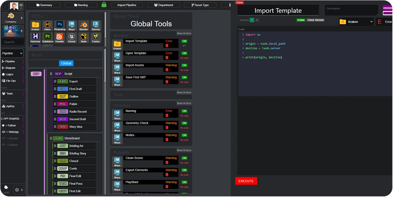 Facilita el trabajo de los TD gestionando y propaga tu código de ejecución para todos tus equipos desde un solo lugar. Lleva a cabo un control de versiones con el que facilitar las ejecuciones y conexiones de todos los programas.Facilitate the work of TDs by managing and propagating your execution code for all your teams from a single location. Implement version control to streamline the executions and connections of all programs.