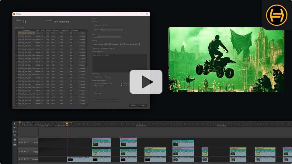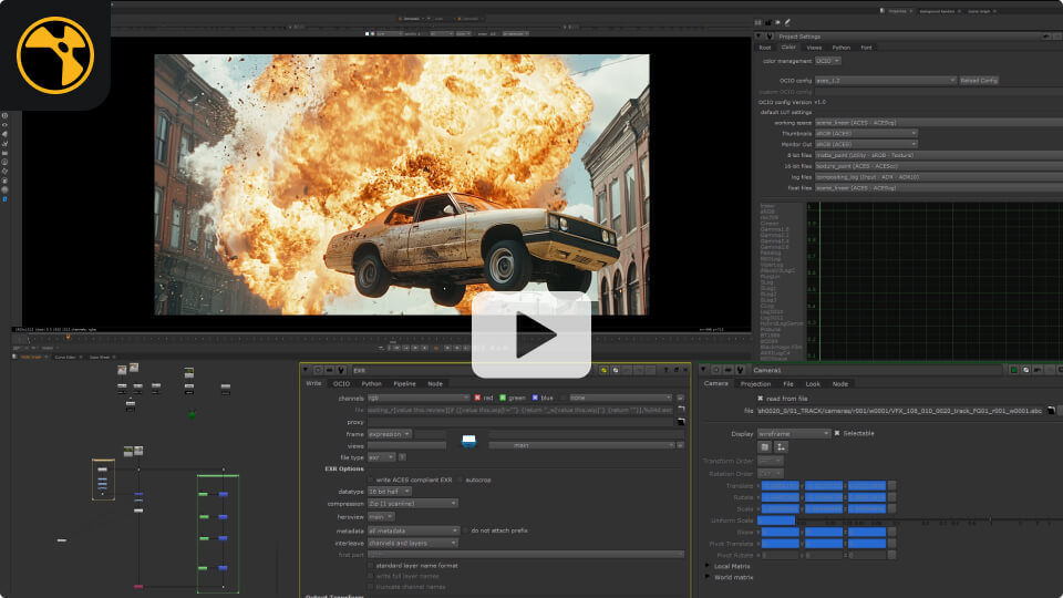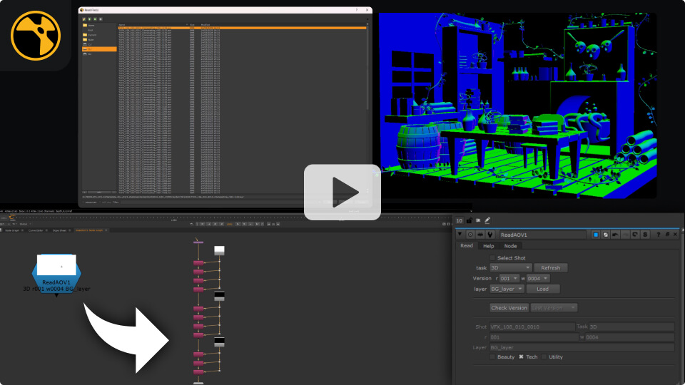 Crea scripts de Nuke desde la ingesta, basados en los parámetros del shot y del proyecto. Configura automáticamente nodos read para plates, cámaras y 3D, y nodos write para revisión editorial.